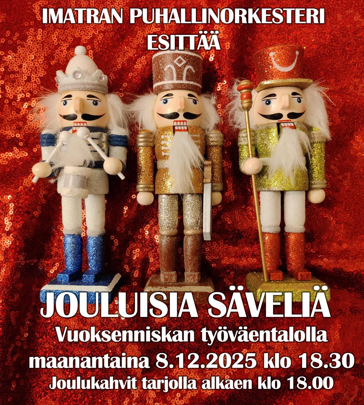Imatran puhallinorkesteri esittää jouluisia säveliä Vuoksenniskan työväentalolla.